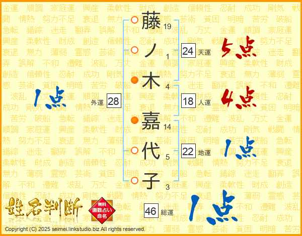 藤(19画)ノ(1画)木(4画) 嘉(14画)代(5画)子(3画)