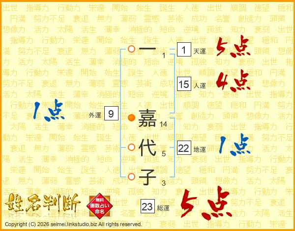 生活面を象徴する運勢です。外部から受ける影響力を表し、結婚運、家庭運や職場、環境への順応性を表します。総運から人運を引いた画数。姓や名が1文字の場合を除く。