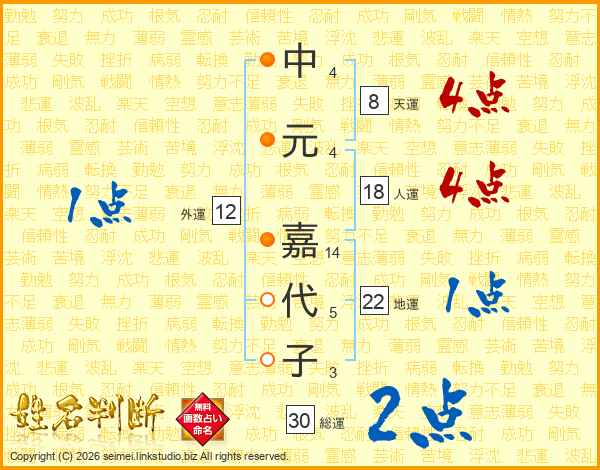 中(4画)元(4画) 嘉(14画)代(5画)子(3画)