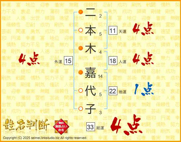 二(2画)本(5画)木(4画) 嘉(14画)代(5画)子(3画)