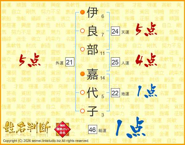 伊(6画)良(7画)部(11画) 嘉(14画)代(5画)子(3画)