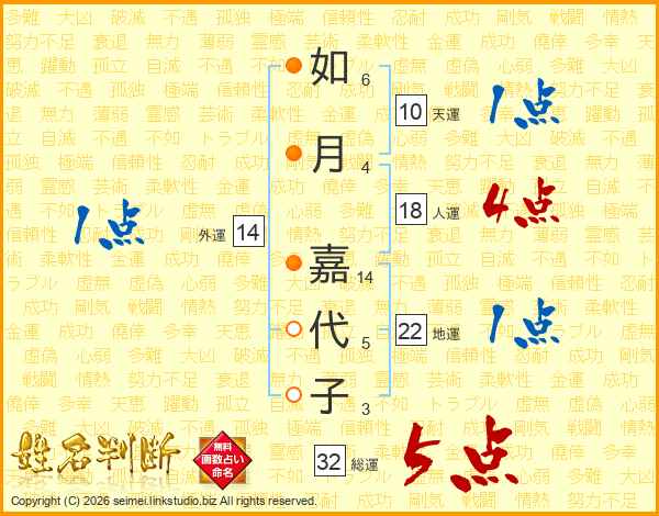 如(6画)月(4画) 嘉(14画)代(5画)子(3画)