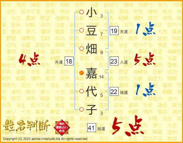 小豆畑嘉代子さんの総運は41画の5点!