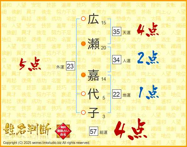 広(15画)瀬(20画) 嘉(14画)代(5画)子(3画)