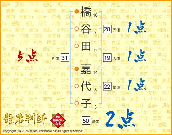 橋谷田嘉代子さんの総運は50画の2点!