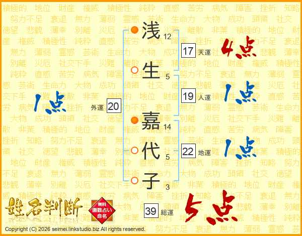 浅(12画)生(5画) 嘉(14画)代(5画)子(3画)