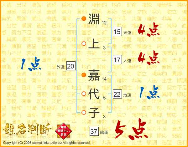 淵(12画)上(3画) 嘉(14画)代(5画)子(3画)