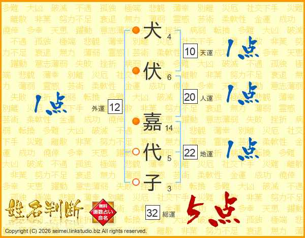 犬伏嘉代子さんの総運は32画の5点!