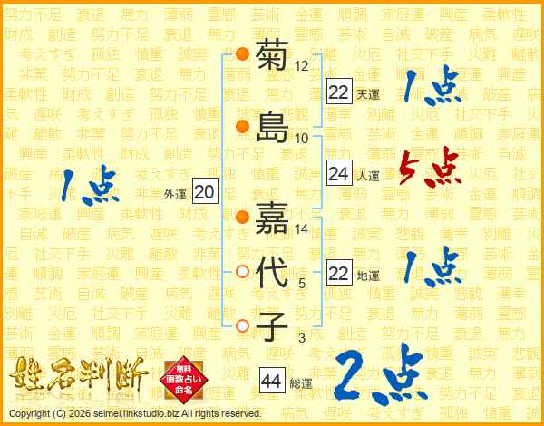 菊(12画)島(10画) 嘉(14画)代(5画)子(3画)