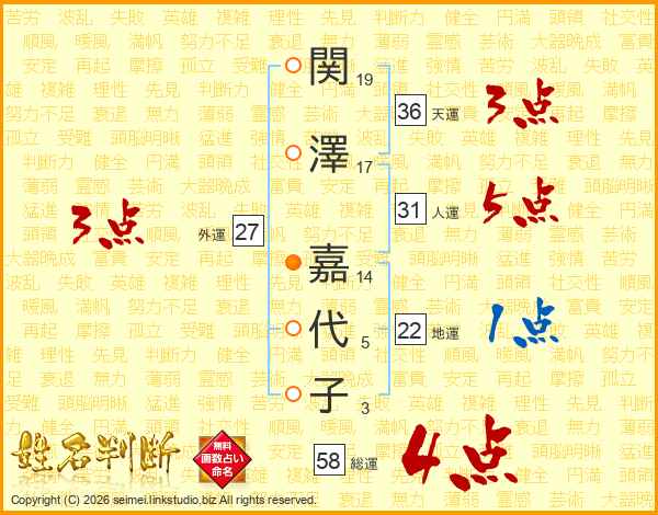 関(19画)澤(17画) 嘉(14画)代(5画)子(3画)