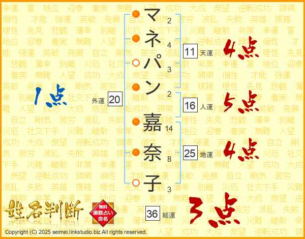 マ(2画)ネ(4画)パ(3画)ン(2画) 嘉(14画)奈(8画)子(3画)