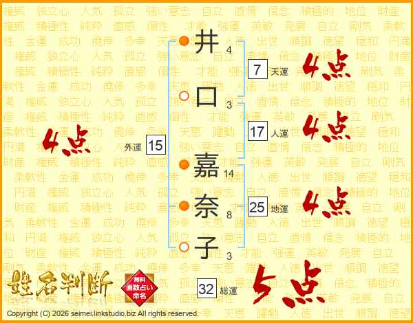井(4画)口(3画) 嘉(14画)奈(8画)子(3画)