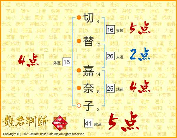 切(4画)替(12画) 嘉(14画)奈(8画)子(3画)
