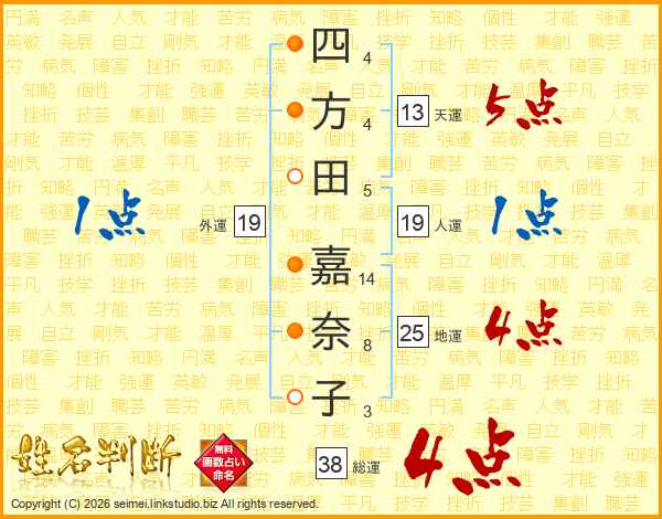 四(4画)方(4画)田(5画) 嘉(14画)奈(8画)子(3画)