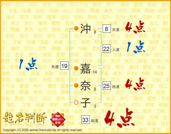 沖(8画) 嘉(14画)奈(8画)子(3画)