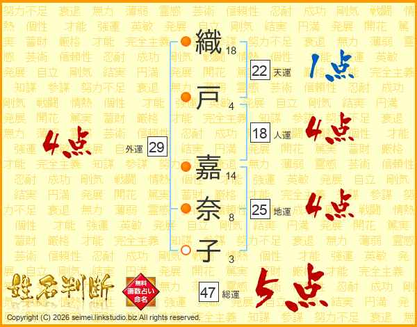織(18画)戸(4画) 嘉(14画)奈(8画)子(3画)