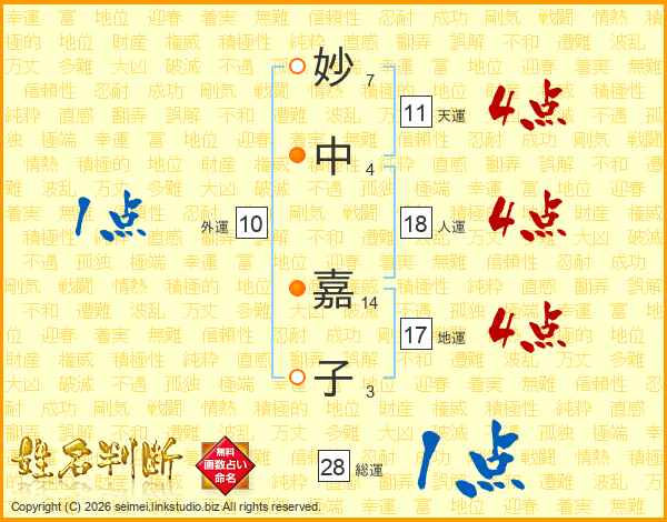 妙(7画)中(4画) 嘉(14画)子(3画)