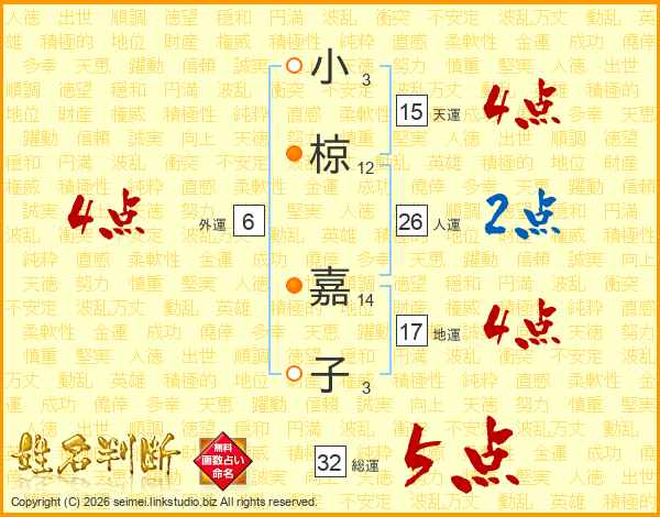 小(3画)椋(12画) 嘉(14画)子(3画)