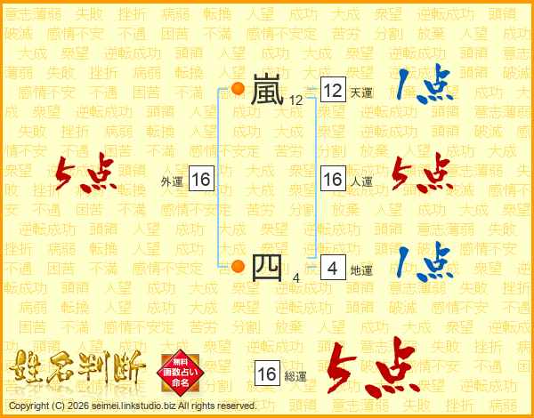 あなたの人生を表す1番重要な運勢です。生涯を通じて影響する総合運となり、主に50歳以降の晩年期に影響を及ぼします。苗字と名前の合計画数。