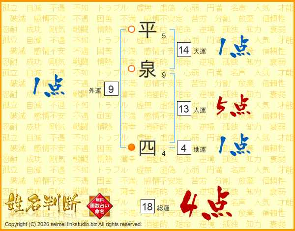 生活面を象徴する運勢です。外部から受ける影響力を表し、結婚運、家庭運や職場、環境への順応性を表します。総運から人運を引いた画数。姓や名が1文字の場合を除く。