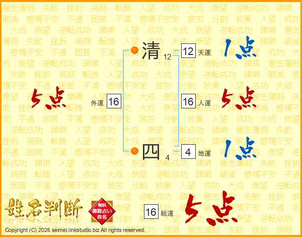 生活面を象徴する運勢です。外部から受ける影響力を表し、結婚運、家庭運や職場、環境への順応性を表します。総運から人運を引いた画数。姓や名が1文字の場合を除く。