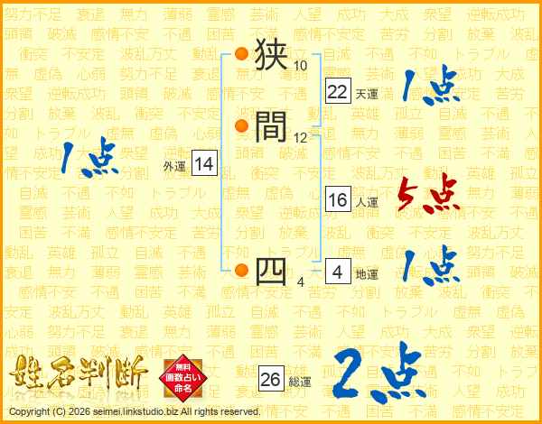 狭間四さんの総運は26画の2点!