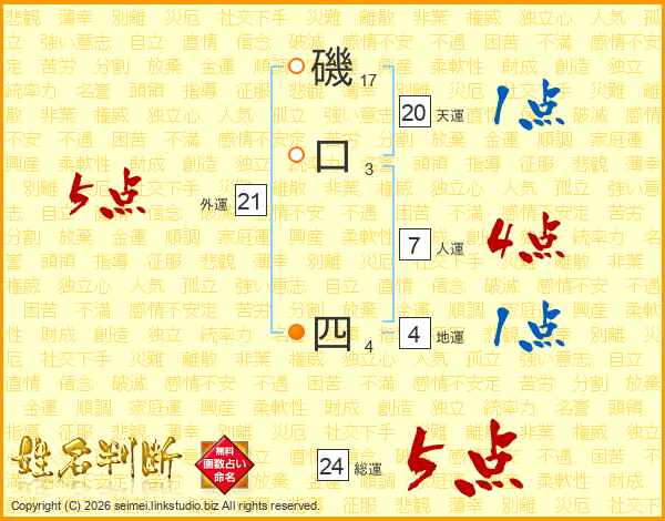 生活面を象徴する運勢です。外部から受ける影響力を表し、結婚運、家庭運や職場、環境への順応性を表します。総運から人運を引いた画数。姓や名が1文字の場合を除く。
