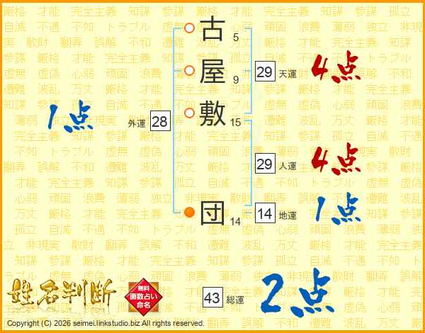 生活面を象徴する運勢です。外部から受ける影響力を表し、結婚運、家庭運や職場、環境への順応性を表します。総運から人運を引いた画数。姓や名が1文字の場合を除く。