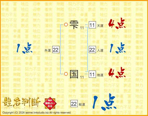 生活面を象徴する運勢です。外部から受ける影響力を表し、結婚運、家庭運や職場、環境への順応性を表します。総運から人運を引いた画数。姓や名が1文字の場合を除く。