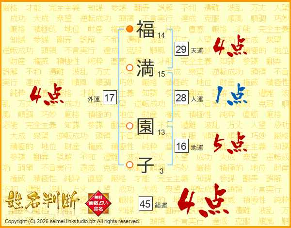 福(14画)満(15画) 園(13画)子(3画)