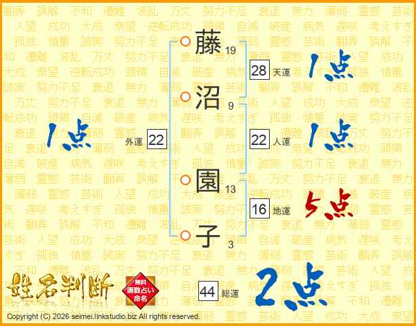 藤沼園子さんの総運は44画の2点!