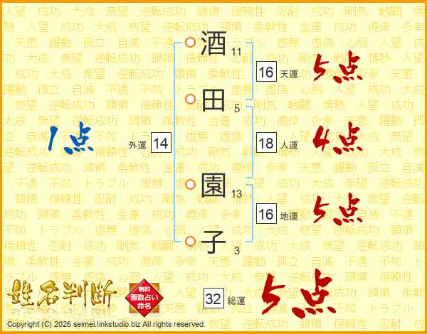 酒田園子さんの総運は32画の5点!