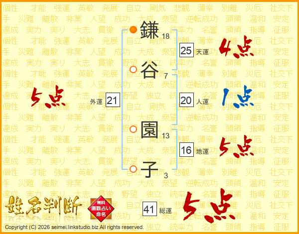 鎌(18画)谷(7画) 園(13画)子(3画)