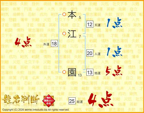 生活面を象徴する運勢です。外部から受ける影響力を表し、結婚運、家庭運や職場、環境への順応性を表します。総運から人運を引いた画数。姓や名が1文字の場合を除く。