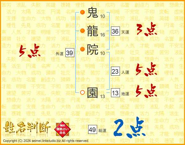 鬼(10画)龍(16画)院(10画) 園(13画)