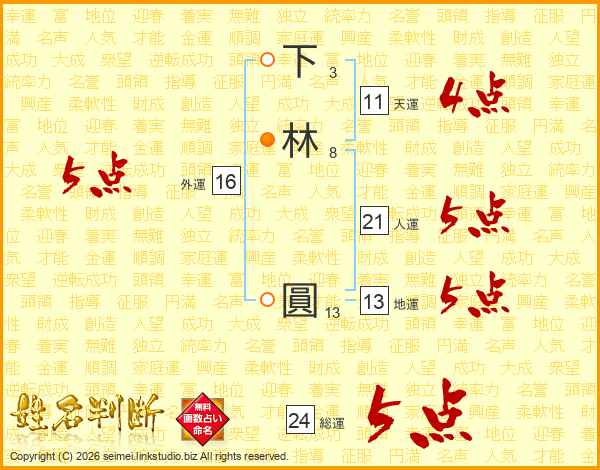 あなたの人生を表す1番重要な運勢です。生涯を通じて影響する総合運となり、主に50歳以降の晩年期に影響を及ぼします。苗字と名前の合計画数。