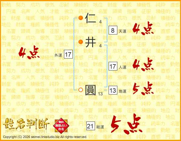 生活面を象徴する運勢です。外部から受ける影響力を表し、結婚運、家庭運や職場、環境への順応性を表します。総運から人運を引いた画数。姓や名が1文字の場合を除く。