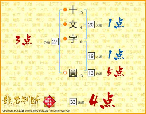 生活面を象徴する運勢です。外部から受ける影響力を表し、結婚運、家庭運や職場、環境への順応性を表します。総運から人運を引いた画数。姓や名が1文字の場合を除く。