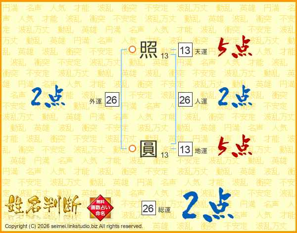 生活面を象徴する運勢です。外部から受ける影響力を表し、結婚運、家庭運や職場、環境への順応性を表します。総運から人運を引いた画数。姓や名が1文字の場合を除く。