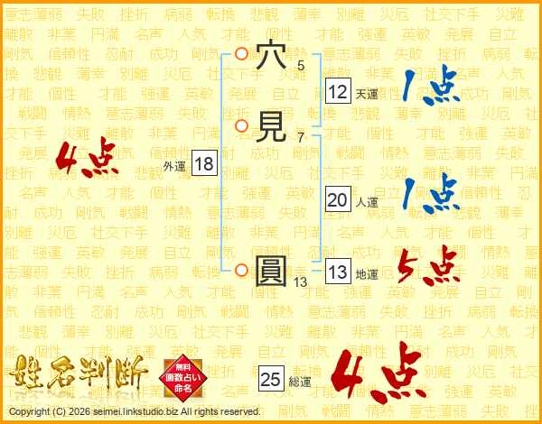 生活面を象徴する運勢です。外部から受ける影響力を表し、結婚運、家庭運や職場、環境への順応性を表します。総運から人運を引いた画数。姓や名が1文字の場合を除く。