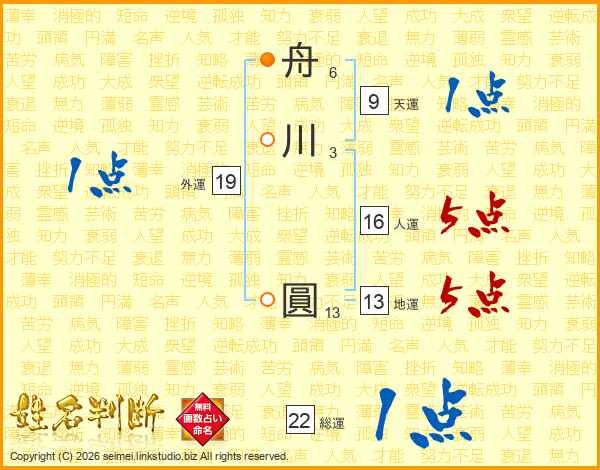 生活面を象徴する運勢です。外部から受ける影響力を表し、結婚運、家庭運や職場、環境への順応性を表します。総運から人運を引いた画数。姓や名が1文字の場合を除く。