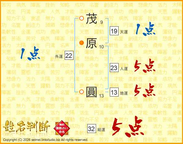 生活面を象徴する運勢です。外部から受ける影響力を表し、結婚運、家庭運や職場、環境への順応性を表します。総運から人運を引いた画数。姓や名が1文字の場合を除く。