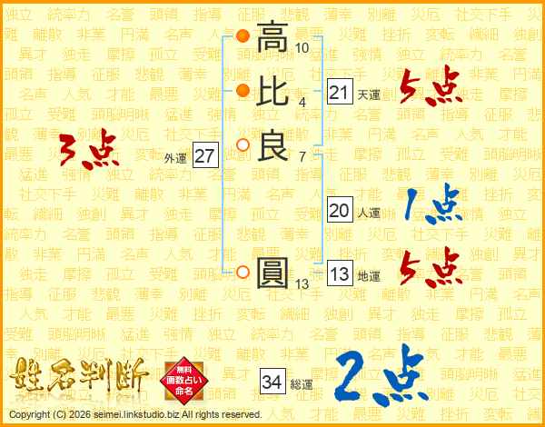 あなたの人生を表す1番重要な運勢です。生涯を通じて影響する総合運となり、主に50歳以降の晩年期に影響を及ぼします。苗字と名前の合計画数。