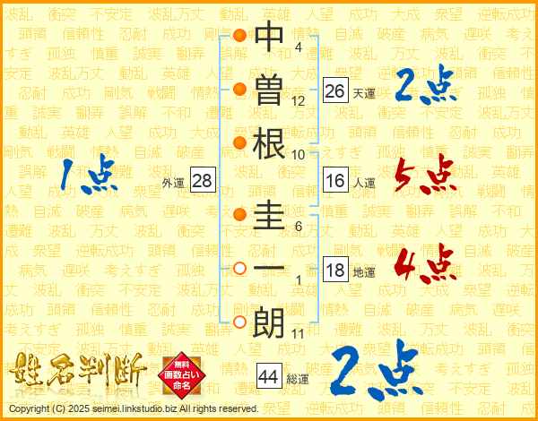 中(4画)曽(12画)根(10画) 圭(6画)一(1画)朗(11画)
