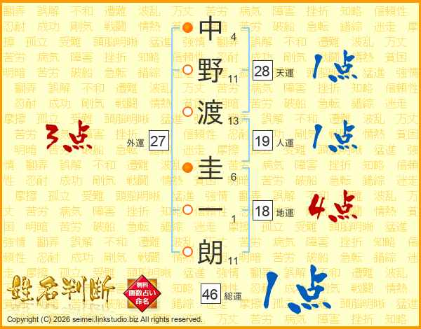 中(4画)野(11画)渡(13画) 圭(6画)一(1画)朗(11画)