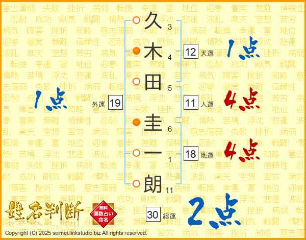 久(3画)木(4画)田(5画) 圭(6画)一(1画)朗(11画)
