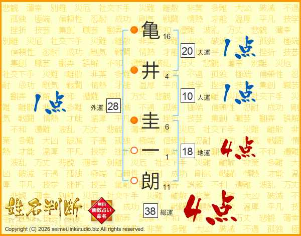 亀(16画)井(4画) 圭(6画)一(1画)朗(11画)