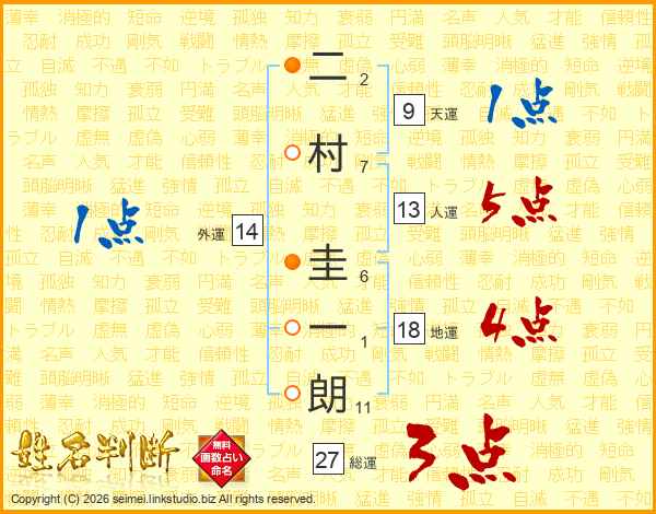 二(2画)村(7画) 圭(6画)一(1画)朗(11画)
