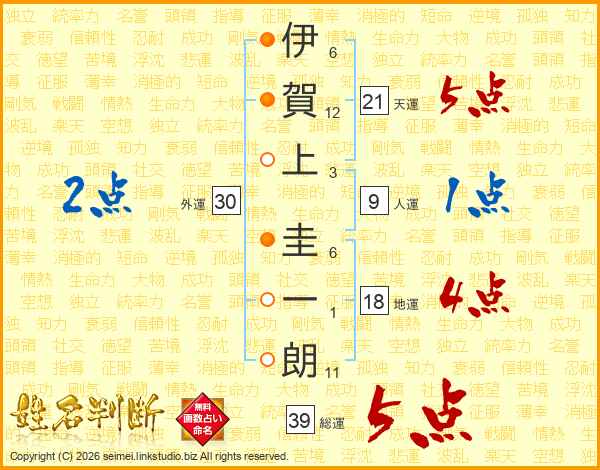 伊(6画)賀(12画)上(3画) 圭(6画)一(1画)朗(11画)