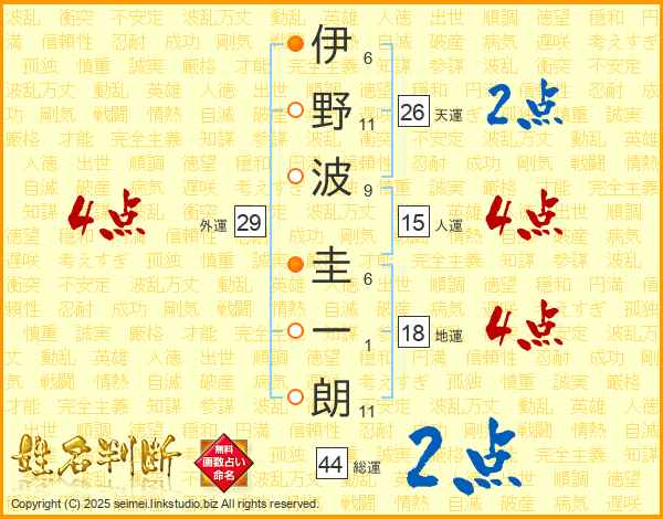 伊(6画)野(11画)波(9画) 圭(6画)一(1画)朗(11画)